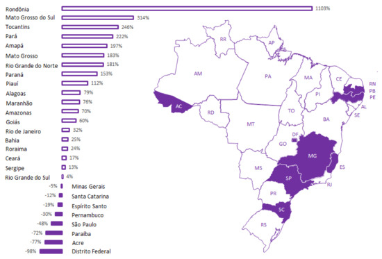 As mentioned previously, although the NEB provides specific information about the states and Federal District, that information is not sufficient to support the analysis of each FU to formulate public policies for the sector or its branches at the state level of government. For example, Figure 3 shows the self-sufficiency of electric energy of each FU considering the year 2019 published in the NEB; however, the overall energetic self-sufficiency was not analyzed due to the lack of data.