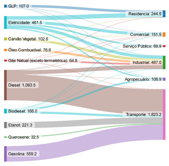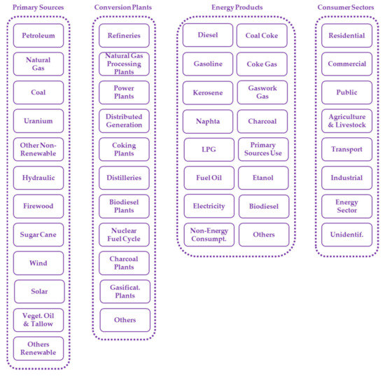 Similarly, the EPE in Brazil defines the EB as accounting for the supply and consumption of energy in the country, considering conversion processes and foreign trade, including other information such as historical series, installed energy capacity and socioeconomic data [19]. In the EBMM publication, the company brings a slightly more complete approach by establishing a context of temporality and territoriality, reinforcing the concept of accounting of a state, region, or country in a reference period. The EBMM report details primary and secondary forms of energy, discriminating the productive activities, storages, foreign trade, conversion and distribution plants, and consumption in the sectors of the economy [20].