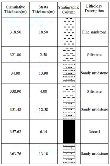 The mohr-Coulomb plasticity model is used for the blocks in the model and the Coulomb slip model is used for the joint surface. The mechanical parameters of the joint surfaces in the coal seam can be seen in Table 4 and each rock layer’s physical and mechanical parameters in the model in Table 5. According to the actual assignment conditions of the working face, the stress boundary condition is set above the Z-direction of the model, and the load distribution is simplified to a uniform load. Below the Z-direction is simplified to a displacement boundary condition, and in the Z-direction is fixed-hinged support, zvel = 0; the boundary conditions at both ends of the X and Y-directions are simplified to a displacement boundary condition, and in the corresponding direction is fixed-hinged support, respectively xvel = 0 and yvel = 0. In a mine, the cut-off depth of the coal miner is 0.865 m, and each production shift can complete three production cycles, with an advance spacing of about 2.4 m. Therefore, in the simulation process, the simulated cycle excavation step is determined to be 2 m, with a total advance of 80 m.