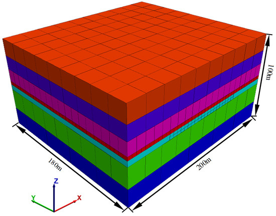 3DEC is a 3-dimensional computer numerical program based on the discrete model display element method [48,49] and is based on the UDEC (Itasca) program. 3DEC is mostly used to simulate the mechanical response of discrete media under static or dynamic loading. When geological conditions are clear, 3DEC makes it easy to define joints and the program can generate a jointed structure or a group of joints automatically or manually. 3DEC numerical simulation software is used to establish the numerical model shown (Figure 5). Due to the limited computer capability, the size of the model established is 200 m × 180 m × 100 m (length × width × height), while considering the boundary effect, the working face length direction and the advancing direction are left 50 m protective coal column, the working face length is 100 m and the working face advancing length is 80 m. The maximum cycle pressure step of the main roof of FHG is 43.3 m, the minimum cycle pressure step is 10.4 m, the average is 20.1 m, the influence range of the cycle pressure period of the working face is about 7.2 m, so the length of the main roof is set to 20 m when building the model.