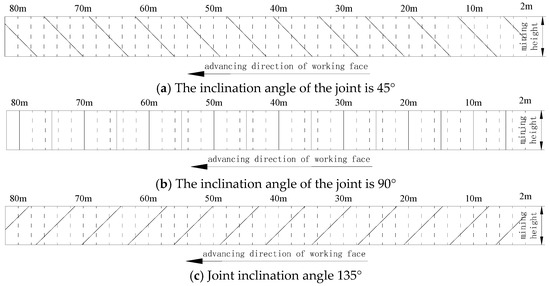Simulations are carried out to analyze coal wall stability under different occurrences of joint surface. Under the condition of joint surface inclination, one set of coal seam joint surfaces is determined under the condition of a hard coal and mining height of 6 m, and three numerical calculation models are established (Table 6, Figure 6). Under the condition of joint surface spacing, two sets of coal seam joint surfaces are determined under the condition of a medium-hard coal and mining height of 6 m, and four numerical calculation models are established (Table 7, Figure 7).