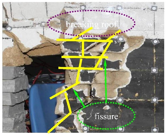 When the main joint of the coal seam is vertical and through (Figure 11), the joint fissures within the coal wall are created and gradually expanded from top to bottom; with the increase of the roof slab sinking, the expansion range of the joint fissures increases in the coal seam thickness direction and horizontal direction, and the displacement of the joint surface near the coal wall increases, which is macroscopically manifested as the increase of the horizontal displacement of the coal wall. The coal wall is cut into a combination of several vertical strips by the influence of the primary joint fissures in the coal seam, and its deformation is manifested as a horizontal displacement with a large middle and upper part and a small lower part, while coal wall stability depends on the stability of the combined strips. With the increase of the roof sinking, the expansion of the joint fissures in the coal wall tends to be stable, with the width of development of the upper and middle parts being 250 mm and the lower part being 200 mm, which is approximately rectangular in distribution, while the height and depth of the rib-spalling of the coal wall are consistent with the expansion development range of the joint fissures.