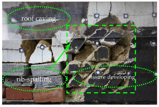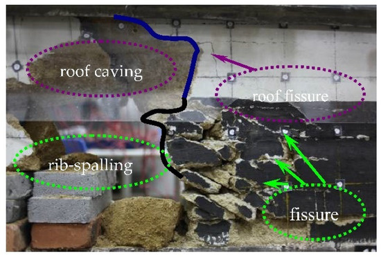Based on the above physical simulation analysis, it is clear that the form and extent of coal wall rib-spalling instability depend on the state of the coal seam joint fissures development area, and the development state of coal seam joint fissures is related to the combination of the coal seam joints. As a result of the sinking of the roof slab and the coal wall rib-spalling, the fissures in the roof slab at the end of the working face are gradually developed. The rib-spalling of the coal wall makes the caving at the end of the working face more obvious and the stability of the end face surrounding the rock is poor. The maximum height of the caving is about 150 mm, and the maximum width of the caving is about 350 mm.