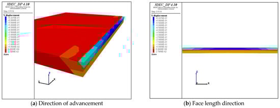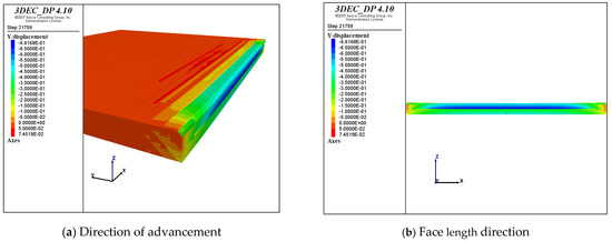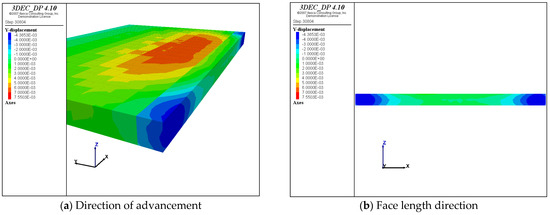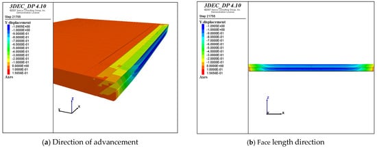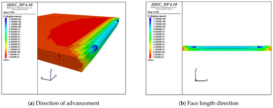 The Y-directional displacement of the coal wall at the working face can be used to define the area of the working face that is susceptible to rib-spalling [49]. The area with the larger Y-directional displacement of the coal wall belongs to the area of the working face that is susceptible to rib-spalling. Under the condition that the coal seam joint surface is orthogonal to the working face when the joint surface inclination is 90°, there is no intersection line between the joint surface and the working face. During the period when the working face is incoming pressure, the Y-directional displacement of the coal wall in the middle and upper part of the working face is the largest; at this time, the middle and upper part of the easy working face is the rib-spalling area. During the period when the working face is non-incoming pressure, the Y-directional displacement of the coal wall at both ends of the working face is the largest; at this time, the two ends of the easy working face are the rib-spalling areas. During the non-incoming pressure period of the working face, the Y-directional displacement of the coal wall at the two ends of the working face is the largest, and the two ends of the easy working face are the rib-spalling area.