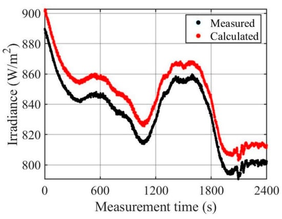 The operating irradiance obtained from the fits to the entire I–U curves with 100 representative points jointly with the measured irradiance during the 40 min measurement period.