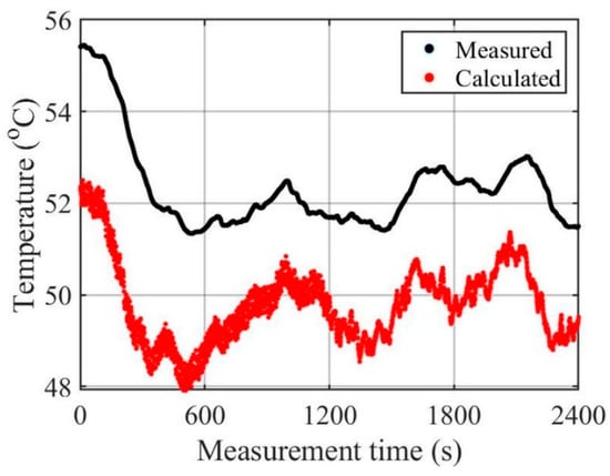 In order to confirm the functionality of the fitting procedure [14,16], the entire I–U curves measured with a I–U curve tracer consisting of 100 representative points were investigated at first. To verify the functionality of the fitting procedure, the most suitable quantities are the PV module operating irradiance and temperature due to the existence of measured reference values. Figure 4 shows the calculated and measured irradiance values as functions of the measurement time during the entire 40 min measurement period. The irradiance values calculated using the fitted curves follow the measured irradiance very closely, being slightly above the measured values, with a difference of about 10 W/m2, in accordance with earlier studies [3,16]. Figure 5 shows the fitted and measured temperature values as functions of the measurement time during the measurement period. The fitted temperature exhibited approximately 2.5 °C lower values than the measured PV module backplate temperature. The main explanation for such a temperature difference is the cooling effect of the wind continuously blowing towards the front surface of the PV panel; thus, PV cells had a lower temperature than the PV module backplate. These results are in agreement with the results published in [3,13,16], which demonstrates the functionality of the chosen single-diode model fitting procedure for the entirely measured I–U curves, which consist of evenly distributed representative points.