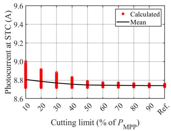 Fitted photocurrent values during the 40 min measurement period converted to STCs as a function of the cutting limit based on MPP power.