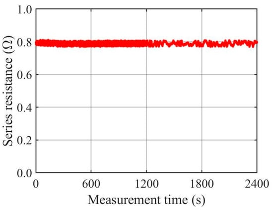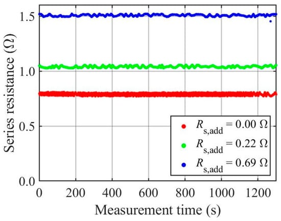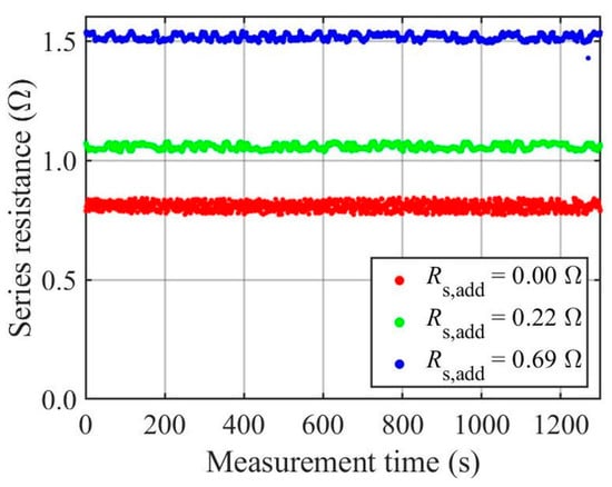 Fitted series resistance values using additional series resistors as a function of measurement time for the entire I–U curves.