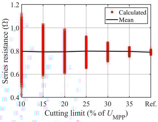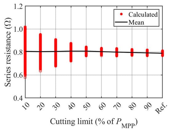 Fitted series resistance values during the 40 min measurement period as a function of the cutting limit based on MPP voltage.