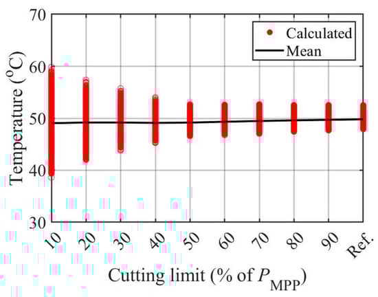 Fitted temperature values during the 40 min measurement period as a function of the cutting limit based on MPP power.