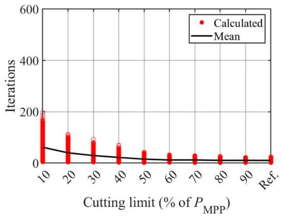 Number of iterations needed for fitting during the 40 min measurement period as a function of the cutting limit based on MPP voltage.