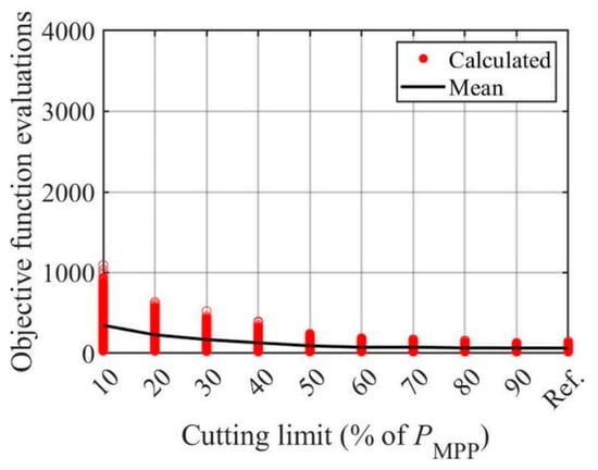 Objective function evaluations needed for fitting during the 40 min measurement period as a function of the cutting limit based on MPP power.