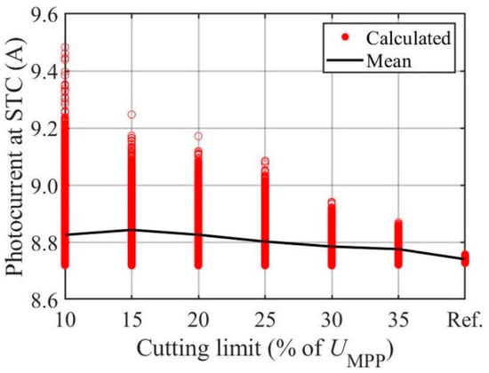 Figure 12 shows the fitted Iph values converted to STCs as a function of the UMPP-based cutting limit during the 40 min measurement period. As with the PMPP-based cutting limit, in the figure, fitting to the entirely measured curves is the reference. The scatter of the calculated Iph, STC values increased significantly with the decrease in the cutting limit, also with high cutting limits. It is noteworthy that the fit was much more unstable than in the case of PMPP-based cutting in Figure 6. This was an expected result, as the UMPP-based partial I–U curves covered a large part of the OC slope but only a small part of the SC slope. Hence, the fit quality in the SC region suffered. This finding is in accord with the example in [3] with 3 V voltage offset to both sides of the MPP. Such an offset corresponded approximately to a cutting limit of 15%. For a cutting limit of 35%, the scatter of the obtained Iph, STC values was approximately equal to that obtained by cutting 30% of PMPP. This is plausible, since in both cases, almost the same portion of the SC slope was covered. One should also note the variation in the mean Iph, STC value with the change in the cutting limit in Figure 12, which indicates that cutting the measured I–U curve with respect to the MPP voltage might not provide fitting results as stable as those obtained by cutting with respect to the MPP power.
