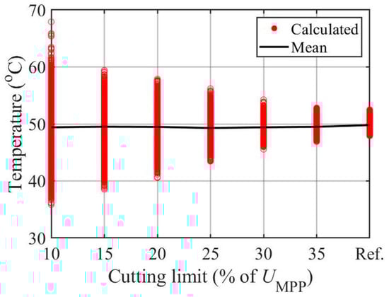 Fitted temperature values during the 40 min measurement period as a function of the cutting limit based on MPP voltage.