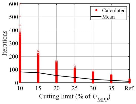 Figure 15 shows the number of iterations used in the fitting procedure as a function of the UMPP-based cutting limit during the 40 min measurement period. A small number of iterations was sufficient for the convergence of the fitting procedure with a cutting limit of 35%. However, the number of needed iterations increased strongly with the decrease in the cutting limit. The shape of the plot in Figure 15 is reflected in Figure 16, where the needed objective function evaluations are presented. It is noteworthy that both indicators of the required computational resources had a much higher scatter than when using the cutting limits based on the MPP power (Figure 10 and Figure 11).