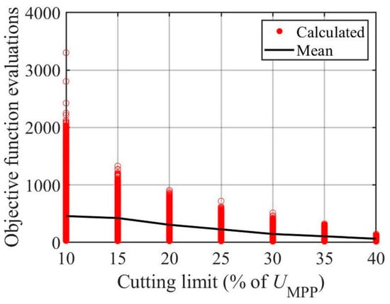 Number of objective function evaluations needed for fitting during the 40 min measurement period as a function of the cutting limit based on MPP voltage.
