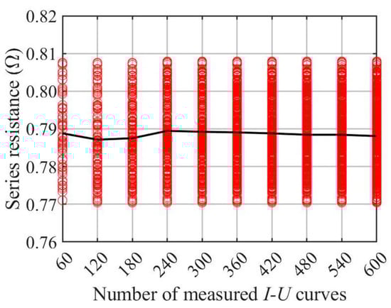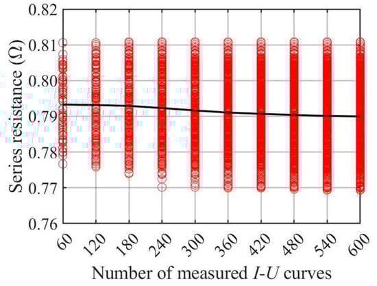 In real-life condition monitoring applications, the number of measured I–U curves required for the reliable identification of series resistance is valuable information. Figure 17 and Figure 18 show the series resistance values identified from the entirely measured I–U curves as a function of the number of I–U curves used for the analysis. Figure 17 and Figure 18 cover 10 min measurement periods of 1–600 s and 1201–1800 s, respectively. The corresponding statistical quantities for the identified series resistances are presented in Table 4.
