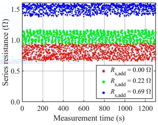 The aging of the examined PV module was emulated by connecting additional resistors in series with the PV module and fitting the single-diode model to the I–U curves measured thereafter. The additional resistors used in the present study had sizes of 0.22 and 0.69 Ω. For the PV module with and without the additional series resistors, high-irradiance measurement periods of 1300 s were chosen for the investigation, i.e., 1300 I–U curves were measured at a sampling frequency of 1 Hz. Figure 19 shows the fitted series resistance values as a function of measurement time when the fitting was performed for the entirely measured curves consisting of 100 representative points. Figure 20 and Figure 21 show the series resistance values when using the cutting limits of 50% and 20% of PMPP, respectively. The corresponding statistical quantities of the fitted series resistance during the measurement period of 1300 s are reported in Table 5.
