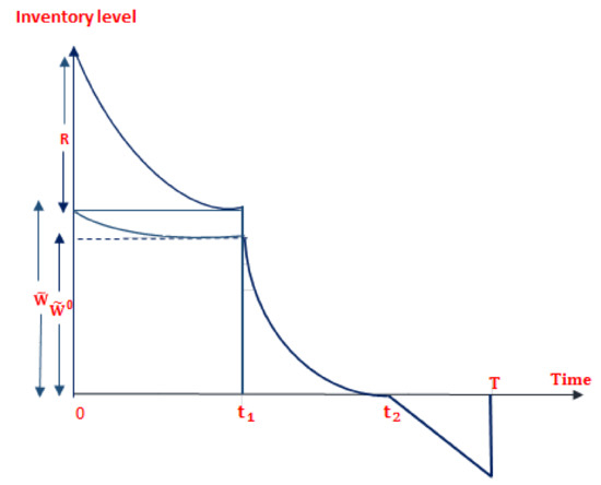 According to the above LIFO model, the inventory level of RW in the time period decreases due to both deterioration and demand. To reduce the rate of deterioration of commodities, this model includes extra preservation facilities for RW, and therefore, the inventory level of RW may be described by the differential equation within the interval .
