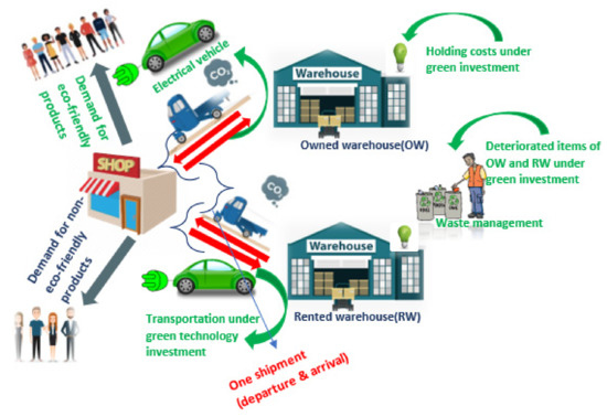 Green investment helps control carbon emissions by reducing the emission fraction to keep the environment clean and safe. Since consumers are increasingly interested in purchasing eco-friendly items, businesses are now interested in using green technologies to save inventory costs and boost brand value. Green warehousing is an advanced technique to implement business in a green environment through multiple ways to study depository inventory systems. By implementing a few changes, we may easily make the depository more eco-friendly without much difficulty; such simpler ways to make the warehouse green are: (i) upgrading warehouse high-efficiency lighting, (ii) investing in energy-efficient equipment, (iii) using fewer packing cuts down on waste, (iv) reuse and recycle materials, (v) build a green or cool roofing system, (vi) add solar panels to a depository, (vi) reduce waste as shown in Figure 1.