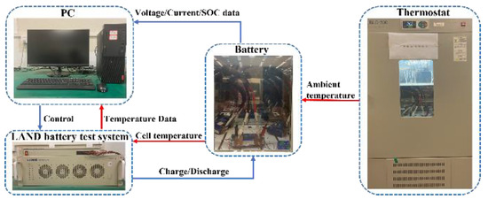 where h is the heat exchange coefficient between the battery pack and the coolant, A is the heat dissipation area of the battery pack, Tcell is the actual battery temperature, and T is the ambient temperature. The heat exchange coefficient h needs to be identified by the thermal characteristic test. The model established in this paper is only used for temperature identification, while the thermostat is used to insulate the test battery, so Qconv is set to zero.