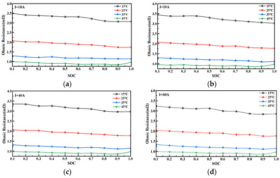 At the same discharge rate, the Ohmic resistance and polarization resistance increase with decreasing temperature and SOC; they decrease with increasing discharge rate when the temperature is constant. The experimental results correspond with the Butler–Volmer equation (BV) (the resistance decreases with increasing discharge current due to the influence of charge transfer within the cell. When the current is tiny, the ability of lithium-ions to cross the interfacial barrier is weak, and the polarization resistance rises sharply). In addition, all test data regression values for impedance parameter identification are higher than 0.9995.