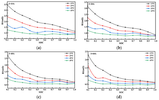 Identification of polarization resistance (R1) of battery: (a) The current of 10 A, (b) the current of 20 A, (c) the current of 40 A, and (d) the current of 60 A.