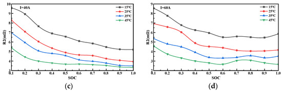 Identification of polarization resistance (R2) of battery: (a) The current of 10 A, (b) the current of 20 A, (c) the current of 40 A, and (d) the current of 60 A.
