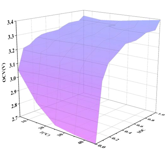where I2R0 + I2R1 + I2R2 is the irreversible heat generated by the voltage drop due to the resistance in the Joule reaction, which always has a positive value; ITcell (dOCV/dT) is the reversible heat of reaction resulting from an entropic change caused by an electrochemical reaction, the positivity or negativity of which is influenced by the direction of the current. dOCV/dT is the entropy coefficient. The relationship between OCV, SOC and temperature is shown in Figure 7.