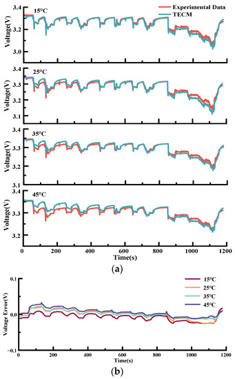 (a) Battery experimental versus simulated voltage at different temperature. (b) Error.