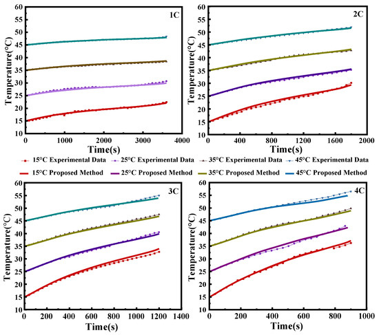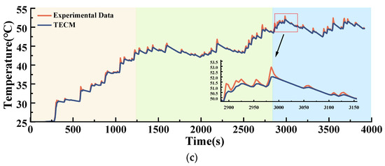 However, in real-world driving cycles, it is common for aggressive driving behavior to cause a rapid increase in battery temperature. The rise in battery temperature often has a lag, which places a high demand on the accuracy of the prediction model. Therefore, it is more convincing to use real driving data to verify the accuracy of the TECM. Figure 14 shows the results of the bus cycle at an ambient temperature of 25 °C.