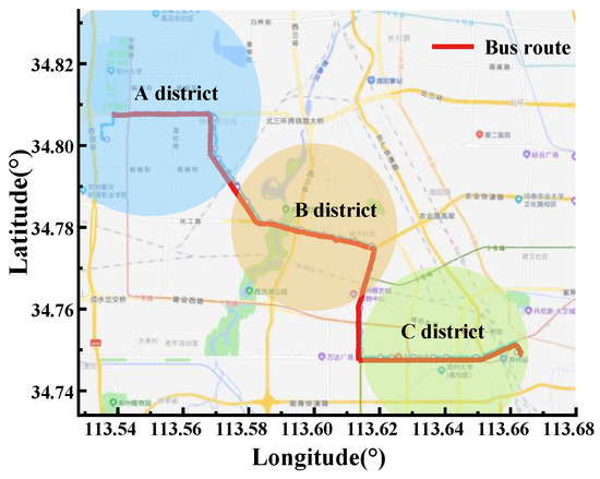 Driving data are collected through a communication system in the vehicle such as Controller Area Network (CAN) which enables information exchange between electronic control units (ECU) and sensors. The data in this article are obtained from one month of driving data on the same bus route. Driving data include the total travel time, SOC, route length, speed, acceleration, accelerator pedal opening (AP), maximum acceleration, maximum deceleration, average speed driving, etc. The bus passes through three areas and the route are shown in Figure 10. A district is a typical suburban area with wide roads and light traffic. B district is an urban area with more traffic lights and traffic flow, and it takes more time for bus to pass through this area than A district at the same distance. C district is the city center with narrow roads and contains densely populated areas such as shopping malls and train stations. Part of the drivers driving speed data on the bus route in A, B, C districts is shown in Figure 11.
