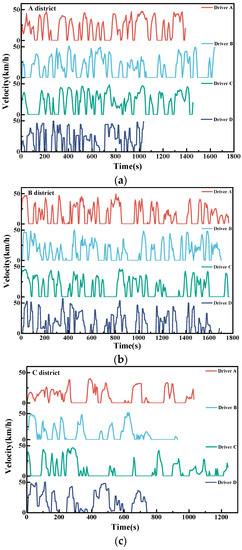 Driving cycle velocity of different drivers in (a) A district; (b) B district; (c) C district.