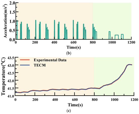 NEDC simulation test consists of urban condition (0–780 s) and suburban condition (780–1180 s) with acceleration of less than 1.1 m/s2 in the whole cycle. Only during each vehicle starting there is a slight speed fluctuation and acceleration is around 1 m/s2, the rest of the time the speed is relatively smooth, and the acceleration is less than 1 m/s2. As presented in Figure 13, the NEDC results at an ambient temperature of 35 °C show that the temperature rise is small at low speeds with smooth driving, while the battery temperature rises cumulatively at high speeds with continuous driving. This means that the gentle driving behavior in NEDC conditions results in a smooth change in battery temperature. Therefore, the TECM model can predict the battery temperature with high accuracy.