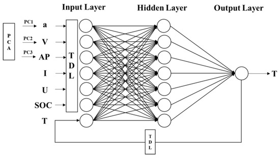 The most commonly used battery thermal models are the electrochemical–thermal coupling model, the thermal equivalent circuit model (TECM), and the data-based model [14]. Xu et al. [15] investigated the thermal runaway phenomenon of LIBs at high temperatures by developing an electrochemical–thermal coupling model that was used to analyze the heat generated by five different types of battery side reactions. However, in practice, the complexity of electrochemical reactions and the numerous sets of partial differential equations that must be calculated in the model lead to slow calculations that do not meet the needs of thermal management systems for real-time temperature estimation [16,17]. TECM is more concise in modeling and better suited for simulating the dynamic behavior of the battery than the electrochemical–thermal coupling model. It was discovered in [18] that one or two RC networks in the equivalent circuit were sufficient to satisfy the electrical behavior. It was unnecessary to use higher-order RC networks for greater accuracy, which would increase the model’s complexity and computation time. Nejad et al. [19] compared equivalent circuit models of two cell types, LiFePO4 and LiNMC, for different orders and found that the model with two RC circuits is preferable for describing the dynamic properties of the cell [20,21]. However, the temperature estimation model was not used in those studies. Geifes et al. [22] developed a first-order thermal equivalent circuit model for small cells and experimentally tested its accuracy. Only estimating the temperature of the battery is insufficient in a practical BTMS application. For BTMS, a real-time model with a prediction function is required, which has contributed to the growth of data-driven battery thermal models. The data-driven model does not need to consider the battery’s physical parameters, but rather establishes a link between the input parameters and the battery’s output response using machine learning methods such as support vector machines [23] or neural networks [24]. The neural network model is more advantageous in establishing nonlinear dynamic relationships. Zhuang et al. [25] proposed a battery prediction model by combining a lithium-ion equivalent circuit model with a fuzzy model. The battery temperature prediction model was able to obtain pack temperature information in advance to achieve active cooling of the battery. Kleiner et al. [26] developed a 3D electro-thermal prediction model for prismatic cells and validated the model temperature prediction with laboratory scenarios. Xie et al. [27] combined the dynamic resistance model with the current distribution model to propose a new electro-thermal model, and verified the accuracy of temperature prediction under the conditions of static and dynamic currents. However, general thermal models often use a feed-forward neural network (FFNN), which can only estimate the cell temperature and cannot feed the estimates back to the input for achieving multi-step heat prediction. In contrast, the NARX neural network is sufficient to achieve feed-forward estimation and feed-back prediction, and has a good advantage in solving the prediction problem of time series. Most of the literature on battery thermal modeling has only used simple constant current charge/discharge or standard driving cycle conditions to test the model’s accuracy, without fully considering the driver data in a real driving cycle as the input variables affecting the battery temperature for the study. Jafari et al. [28] investigated the effect of driving style on battery capacity decay by using real-driving cycle data. Mudgal et al. [29] found that aggressive driving behavior increases energy consumption by 5–33%. The increased energy consumption is used to cool the temperature rise caused by aggressive driving [30]. Aggressive driving behavior increases the instantaneous current and leads to a rapid increase in battery temperature [31], while gentle driving behavior enables a smooth discharge of the LIB and the internal temperature of the battery does not rapidly rise. However, there is little literature focused on the influence of driving behavior on the internal temperature of battery. As a consequence, research into the effect of driving behavior on battery heating is important.