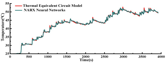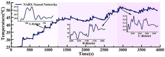 The predicted battery temperature using the NARX neural network is shown in Figure 16. The comparison of the neural network model and actual battery temperature is shown in Figure 17. The maximum temperature difference is 1.20 K, and the average temperature difference is 0.11 K. The battery temperature rose from 25 °C to 39.5 °C while the bus was driving in the A district, and the instantaneous temperature rise of 4 K was affected by aggressive driving behavior (acceleration greater than 1 m/s2). B district is the urban area with more stations, where aggressive driving behavior has increased significantly. When entering and leaving the stations, rapid acceleration and deceleration could cause the local temperature of the battery to rise rapidly. Due to the high traffic and long idling time in C district, buses usually drive at a low speed. The instantaneous temperature rise of the battery in this district is between 1 and 1.5 K. However, the cumulative driving time of the bus is long, and the heat gathering causes the battery temperature to already be as high as 52.5 °C. The temperature rise of the vehicle for a one-way operation of the bus is 27.5 K.