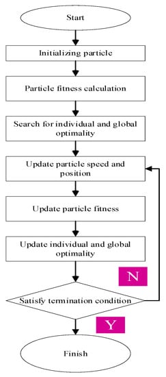 where i = 1, 2, 3, …, m represent the particle number; k is the number of iterations; w is the inertia weight; c1, c2 are learning factors; r1, r2 are independent random numbers with values of 0–1 to increase the randomness of the search. The flow chart of the PSO is shown in Figure 3.