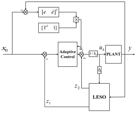 LADRC consists of linear extended observer (LESO), tracking differentiator (TD) and linear error state feedback (LESF) control law [37,38]. The structure of the A-LADRC controller is shown in Figure 4. LESO observes the total disturbance of the system through the input signal and output signal of the controlled object and compensates it through LESF. The tracking error is defined according to the difference between the output signal of the system and the expected signal , and an adaptive law is designed according to the tracking error. The parameter in the LESF is adjusted through adaptive control.