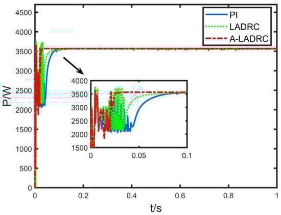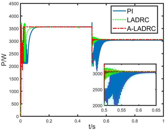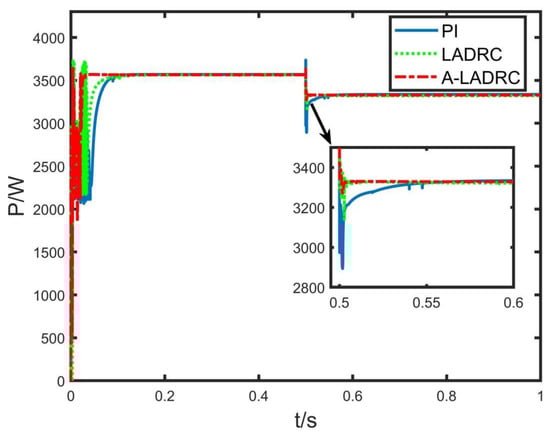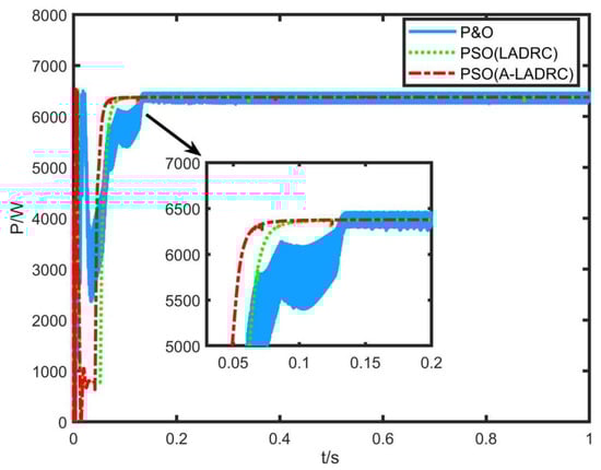 Figure 11 shows the tracking process of the MPPT controller based on the PSO algorithm optimized by the LADRC controller and then by the A-LADRC controller under the condition of local shadows. Figure 11 shows that the PSO algorithm can effectively solve the multi-peak problem of the P-V output curve caused by local shadows, and can accurately find the MPP. The output power under A-LADRC control is stable at 0.03 s, while that under LADRC control is stable at 0.08 s and that under PI control is stable at 0.95 s. Therefore, the A-LADRC controller has a shorter response time and a faster response speed. The change curve of under local shadow condition is shown in Figure 12. At this time, the value of is adjusted compared with that under uniform lighting conditions, which improves the control performance of the controller under this external condition.