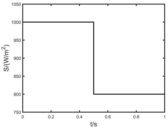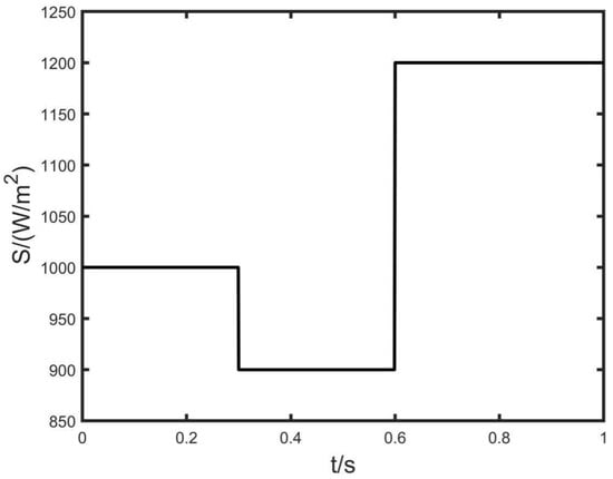 In order to prove that the MPPT control strategy combined with PSO and A-LADRC can effectively and rapidly track the MPP under the external conditions of uniform light, this paper makes the following simulation states for the simulation environment under uniform light. (1) Experimental environment 1: the light condition of the photovoltaic array is set to 1000 W/m2, and the temperature is set to 25 °C. (2) the change curve of light conditions of photovoltaic array is shown in Figure 7, and the temperature is set at 25 °C. (3) The light conditions of the photovoltaic array is set as 1000 W/m2, and the temperature change curve is shown in Figure 9. On the basis of the above three external conditions, the traditional P&O method, the control method combining PSO with LADRC and the control method combining PSO with A-LADRC are selected as the MPPT control strategy. The simulation results of the three methods are compared and discussed.