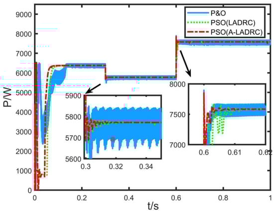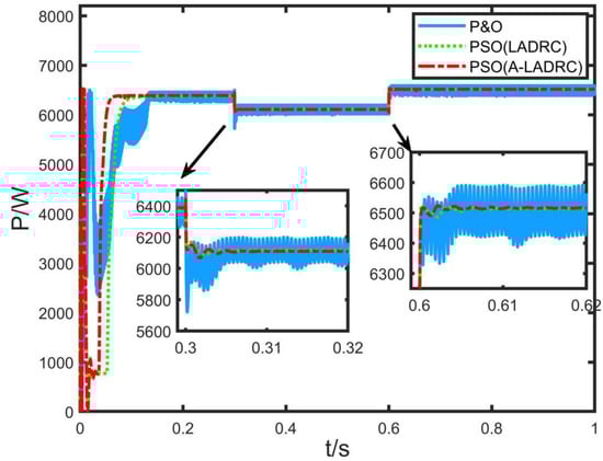 Figure 7 shows the curve of light intensity change of the whole photovoltaic array. In 0.3 s, the light intensity drops from 1000 W/m2 to 900 W/m2. At 0.6 s, the light intensity increases from 900 W/m2 to 1200 W/m2. Figure 8 shows that when the light intensity decreases, the output power under P&O control reaches a stable state at 0.31 s, but the overshoot amplitude is 281.92 W during the transient regulation process and the output power under the control of PSO combined with LADRC returns to a stable state at 0.32 s; The output power under the control of PSO combined with A-LADRC recovers to the stable state at 0.315 s, and the power fluctuation under the control of this method is small in the transient process. When the light intensity increases at 0.6 s, the three MPPT control methods can still effectively track the MPP. The method proposed in this paper makes the output power return to the stable state at 0.61 s. Compared with the P&O method and PSO combined with LADRC method, this method has a shorter transient regulation process and smaller fluctuations, and the tracking accuracy is higher.