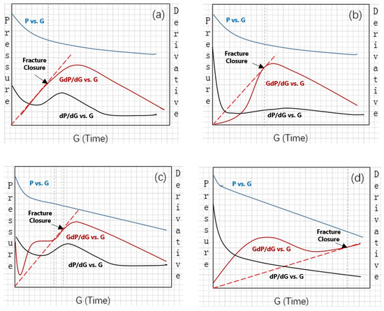 Type of pressure vs. G-function, dP/dG vs. G-function, and GdP/dG vs. G-function trends: (a) normal leak-off behavior and (b) non-ideal leak-off behavior (I) that depicts a signature of height recession/transverse storage. (c) Non-ideal leak-off behavior (II) that depicts a signature of pressure-dependent leak-off behavior, which occurs when the fluid-loss rate varies significantly with the pressure-dependent permeability in a dual-porosity system (usually micro-cracks and natural fractures exist in these cases). (d) Non-ideal leak-off behavior (III) that demonstrates a signature of fracture tip extension, which occurs in low-permeability reservoirs.