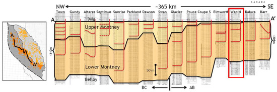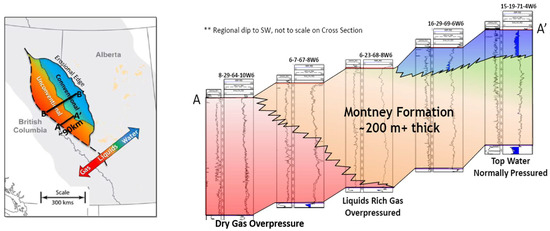 Unconventional hydrocarbon resources, including shale hydrocarbon, tight hydrocarbon, and coalbed methane, have become an increasingly essential part of the global oil and gas supply during the past decades [1,2]. Compared to conventional plays, unconventional formations have different transport properties at pore scale, such as extreme low permeability and the dispersion effect, which significantly affect hydrocarbon production [3]. Therefore, in the development of unconventional hydrocarbon exploration, predicting key reservoir properties, such as in situ stress and formation pore pressure, plays a significant role in both geological science and subsurface engineering workflows. Understanding pore pressure, closure pressure, and net pressure are important for the development of an unconventional reservoir [4,5,6,7]. While advanced drilling, completion, hydraulic fracturing, and reservoir stimulation technologies have become more mature recently, low- and extremely low-permeability formations can be developed more efficiently, which can potentially bring huge benefits to the global oil and gas industry [8]. However, there are very few academic publications discussing the geo-stress, pore pressure, net pressure, permeability, and corresponding DFIT applications in Canada’s Montney Shale, while few study were continued in the Wapiti Montney shale formation.