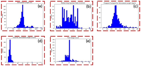 In Figure 5, stratigraphically, the Montney unconformably overlies the Permian Belly formation and is abruptly overlain by the Triassic Doig source rock in most of the Wapiti field. The top of the Wapiti Montney ranges from 2200 to 2900 meters in true vertical depth from the surface. The formation average thickness is over 200 meters, and intervals consist of shale, siltstone, and fine-grained sandstones. Due to the over-pressurized nature, the porosity and permeability are low, ranging from 3.0–6.0% and 0.005–0.05 mD, respectively. More reservoir information is summarized in Table 1. Additionally, five key engineering parameters are shown by the statistical histogram in Figure 6.