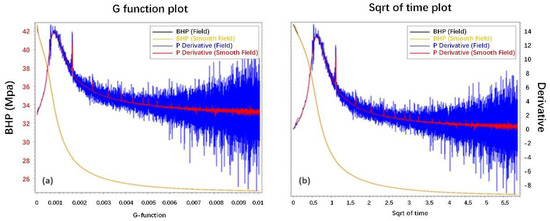 To estimate the closure pressure and the pore pressure of the formation, the DFIT data presented above are analyzed by the pressure and GdP/dG vs. G-function plot and the BHP and vs. the square root of time plot, as shown in Figure 8a,b. The G-function and the square root of time plots deliver the same message, while it is easier to interpret time by the second plot. There are noises in the GdP/dG response after the closure time, which is commonly observed in the DFIT analysis. In this study, the data noises are smoothed by the Butterworth filter, after which the filtered signals become clean and explicit, demonstrated by the red line in Figure 8a,b. The general GdP/dG response from the Well-A DFIT presents a characteristic concave upward trend, indicating a signature of pressure–loss–acceleration behavior, which results from height recession and/or transverse storage mechanisms.