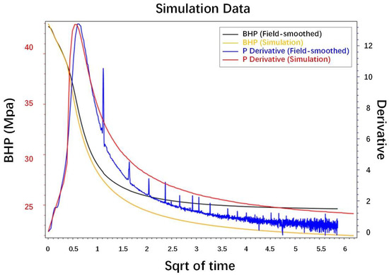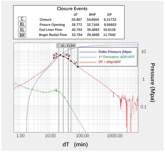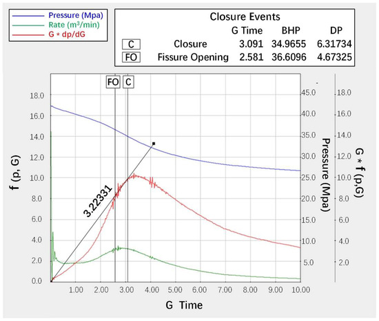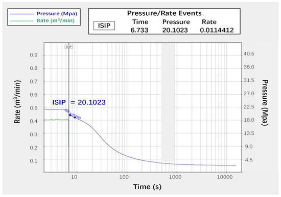 After the pump was shut down, an instantaneous shut-in pressure of 42 MPa is captured from the data, and this ISIP can be verified in the following G-Plot analysis, as shown in Figure 7. The pressure response was recorded for 10 days, with a minimum pressure of 2.32 MPa, as shown in the inserted semi-log plot in Figure 9.