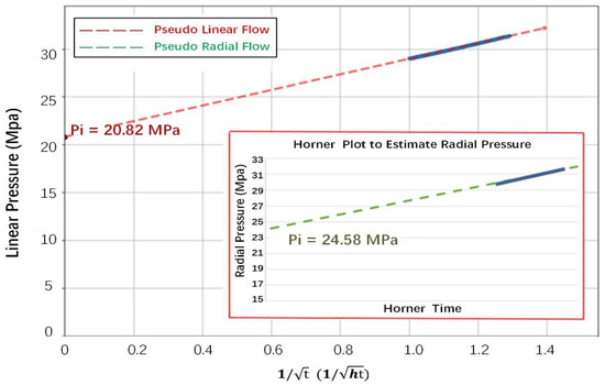 Pore pressure is estimated by pressure transient analysis. The main image shows pore pressure determination by linear flow regime, and the inserted image shows pore pressure determination by radial flow regime.