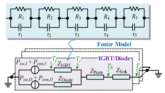 The electrothermal model of a semiconductor can be represented by a branch of an RC network (Foster model), as shown in Figure 2 [43]. The Foster model uses linear components (RC) to capture the linear properties of the thermal behavior and eliminate nonlinearities. The accuracy of a Foster model is acceptable for steady-state analysis; thus, the electrothermal model for semiconductors proposed in this paper adopts the Foster model. The power losses are passed through the device Foster model and result in the device junction temperature. The parameters of the Foster models of the diodes and IGBTs proposed in this paper are summarized in Table 4. The Foster models for the semiconductors proposed in this paper contain five RC branches to maintain consistency with the original data from the manufacturers.