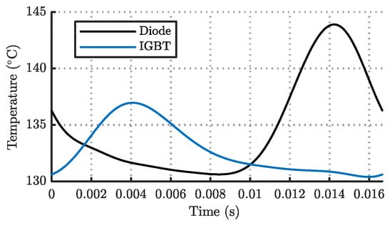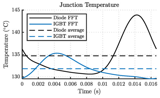 Recovered time-domain diode and IGBT junction temperature for one electric cycle (60 Hz) in a PV inverter [40].