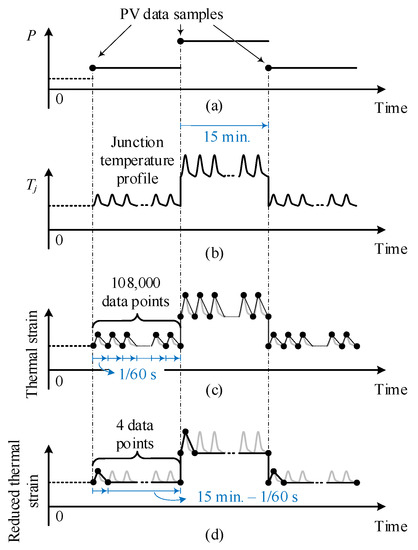 The complete strain profile is typically reduced to a smaller set of profiles by discarding small stress cycles before applying the rainflow-counting algorithm [49]. Therefore, the 60/50 Hz thermal cycling in the semiconductor junction temperature profile can be neglected to accelerate the rainflow-counting algorithm.